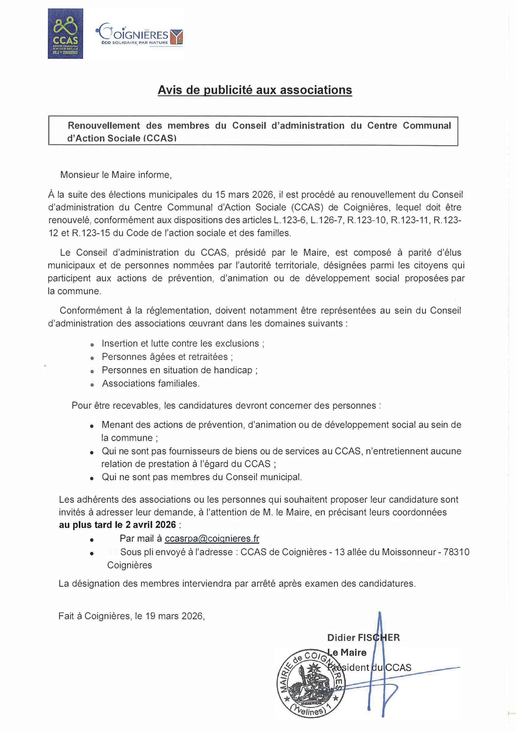 Avis de publicité aux associations – Renouvellement des membres du conseil d’administration du Centre Communal d’Action Sociale (CCAS)