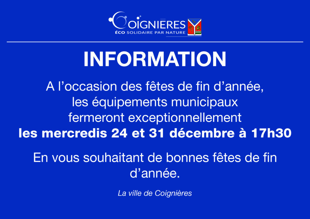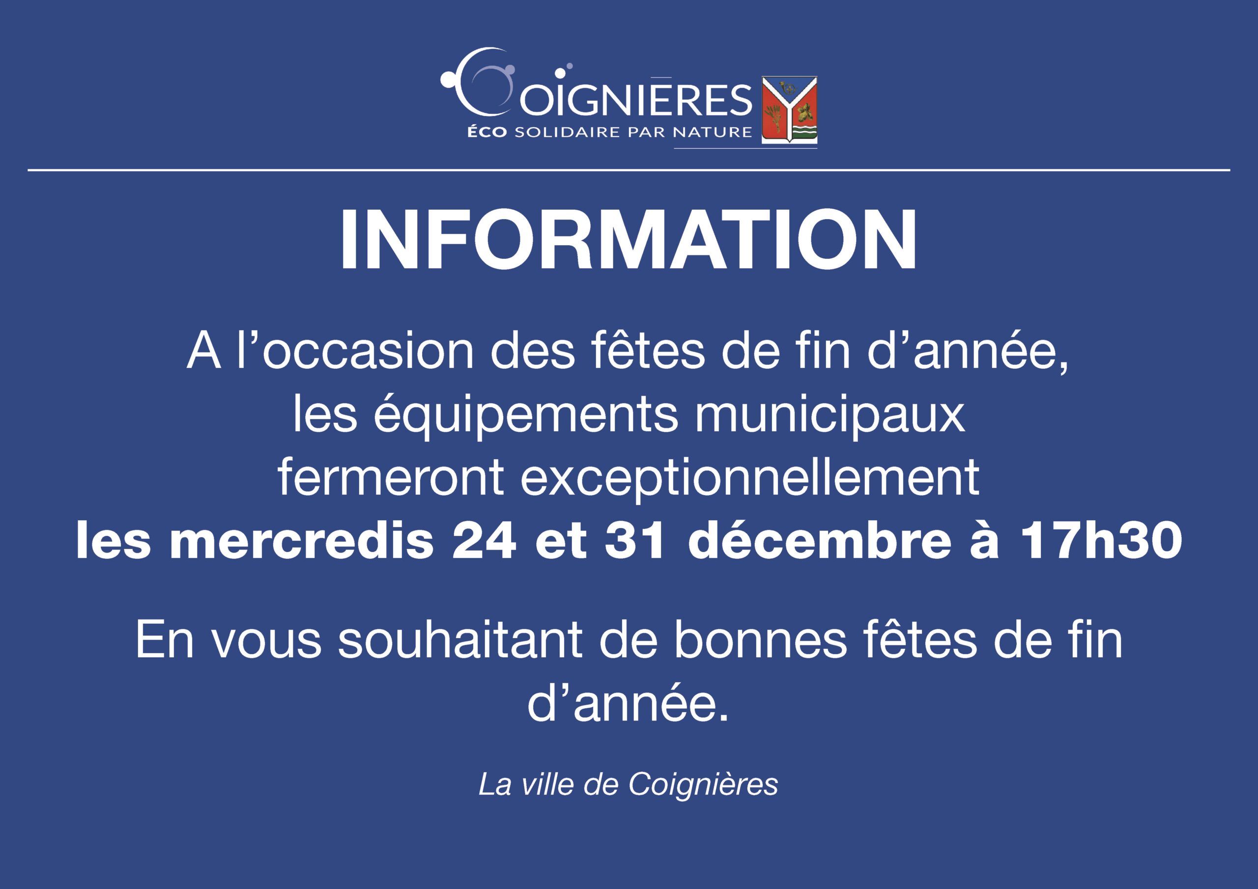 Mercredi 31 décembre : fermeture exceptionnelle des équipements municipaux à 17h30 Publié le 25 novembre 2025 Précédent Retour à la liste Suivant