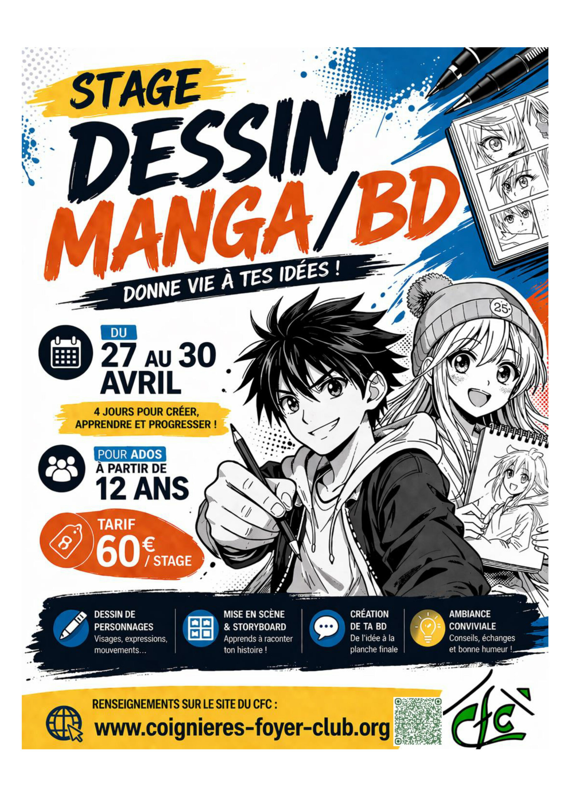 Participez à un stage “dessin/manga/bd” du 27 au 30 avril à la Maison de Voisinage Le stage est ouvert aux jeunes à partir de 12 ans. Publié le 22 avril 2026 Inscriptions ici – Tarif : 60€ Précédent Retour à la liste Suivant