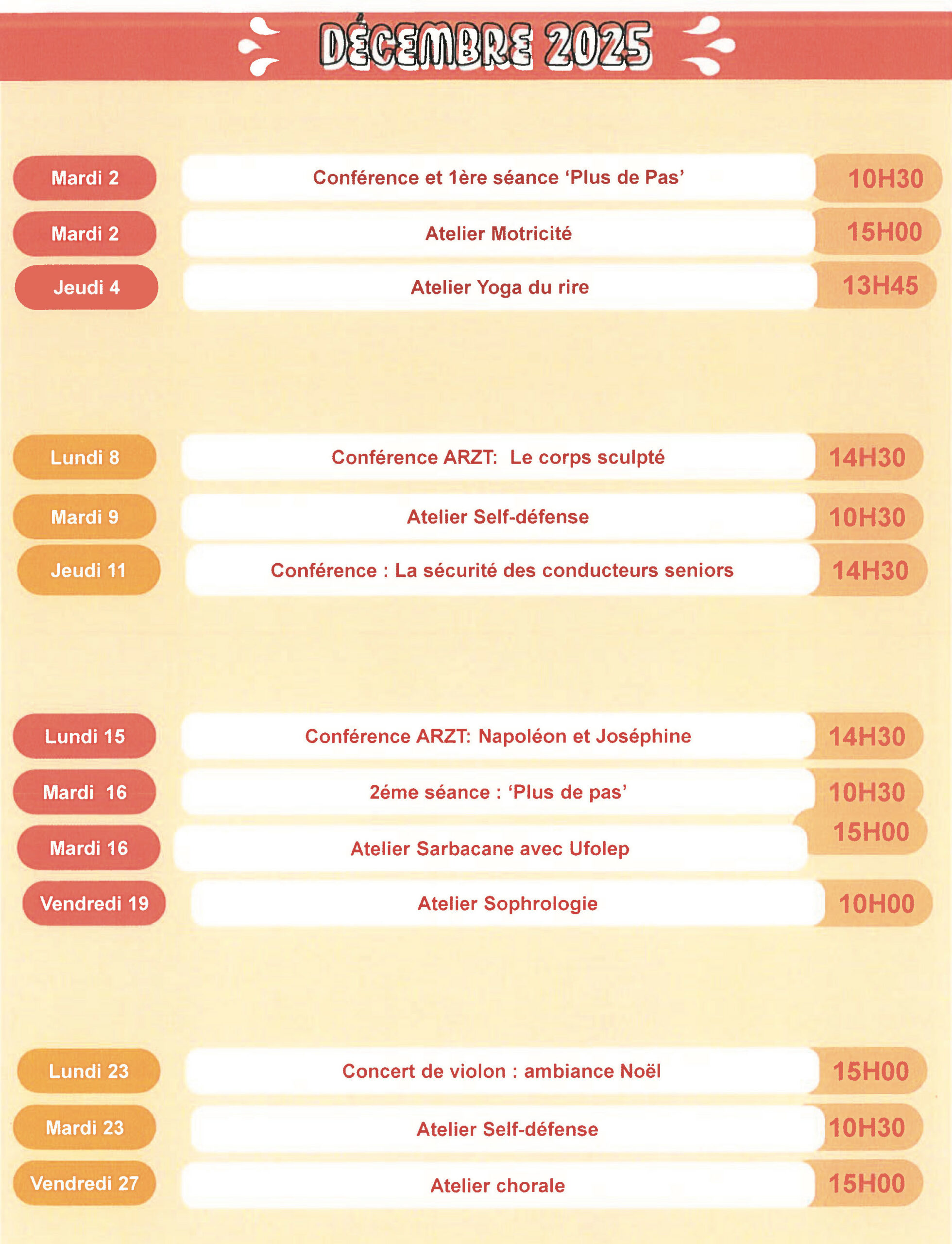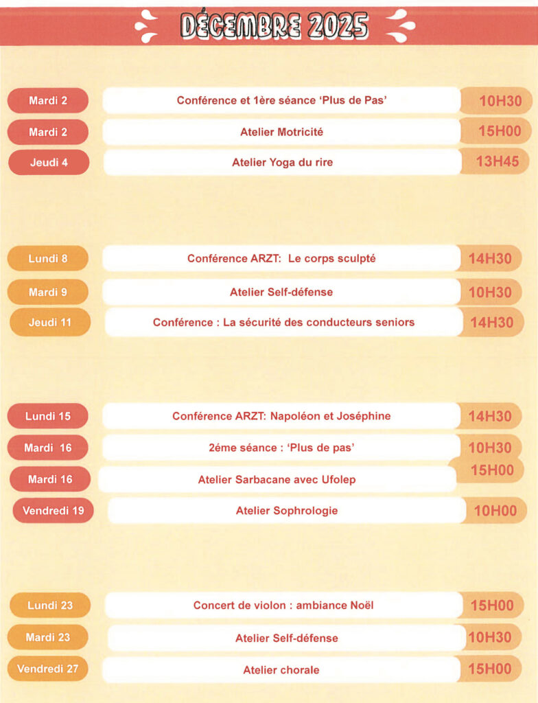 Activités, Extérieurs, Inscriptions, Résidence-autonomie, Seniors Résidence-autonomie : des animations ouvertes aux retraités non-résidents en décembre Découvrez, ci-après, le programme des animations proposées au mois de décembre 2025. Publié le 21 novembre 2025 Inscriptions 48 heures avant l’activité au 01 34 61 45 75 ou par mail à ccasrpa@coignieres.fr Localiser Choix du plan © Contributeurs OpenStreetMap Fermer Précédent Retour à la liste Suivant