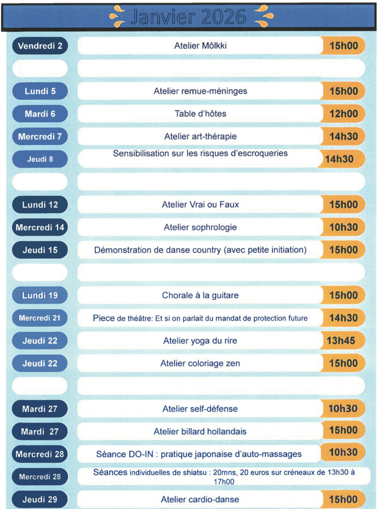 Activités, Extérieurs, Inscriptions, Résidence-autonomie, Seniors Résidence-autonomie : des animations ouvertes aux retraités non-résidents en janvier Découvrez, ci-après, le programme des animations proposées au mois de janvier 2026. Publié le 5 janvier 2026 Inscriptions 48 heures avant l’activité au 01 34 61 45 75 ou par mail à ccasrpa@coignieres.fr Localiser Choix du plan © Contributeurs OpenStreetMap Fermer Précédent Retour à la liste Suivant