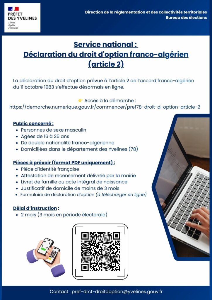 Service national : la déclaration du droit d’option franco-algérien s’effectue désormais en ligne Publié le 20 janvier 2026 Cette démarche concerne : Les personnes de sexe masculin ; Âgées de 16 à 25 ans ; De double nationalité franco-algérienne ; Domiciliées dans le département des Yvelines + d’infos ici Précédent Retour à la liste Suivant