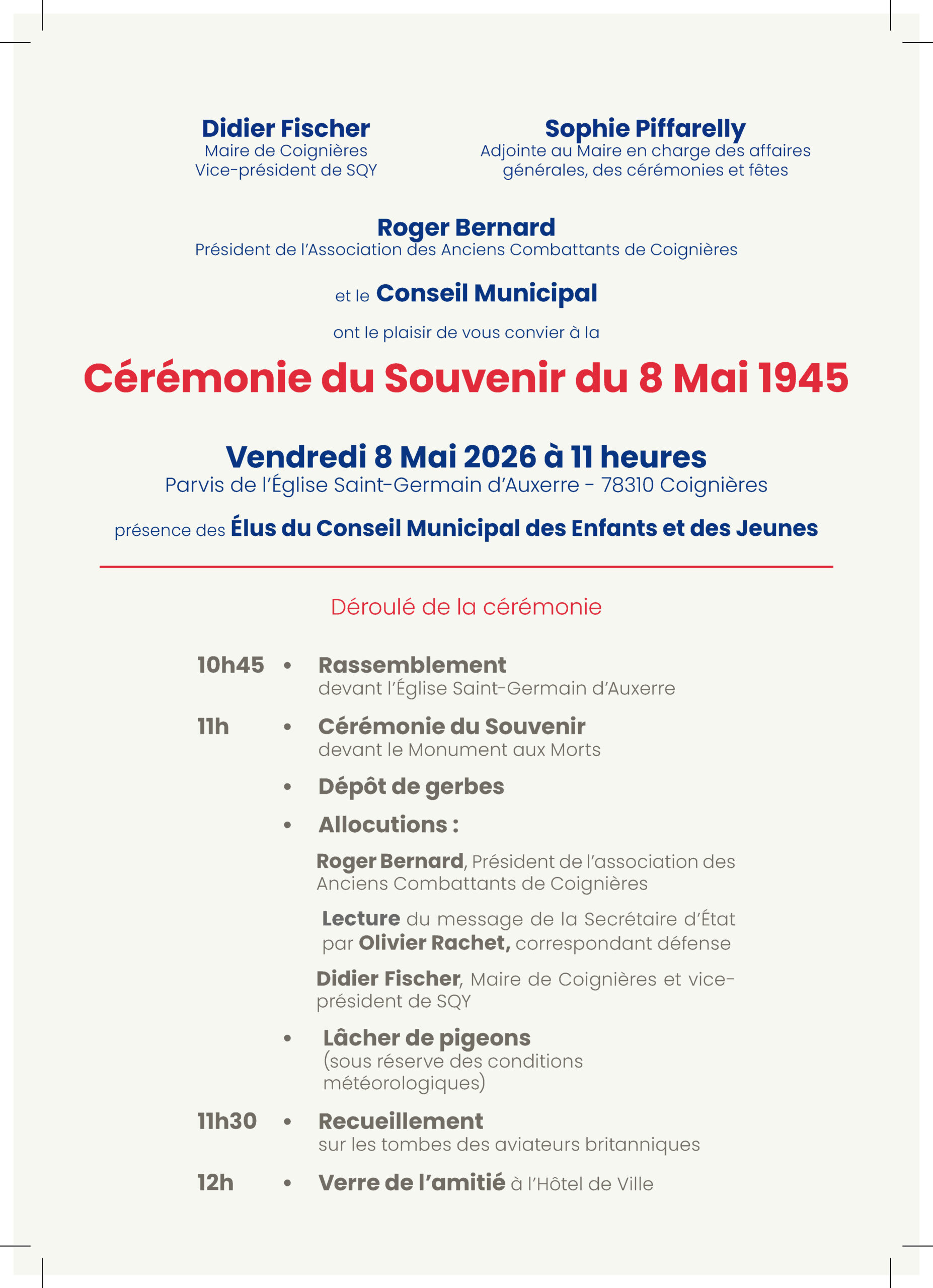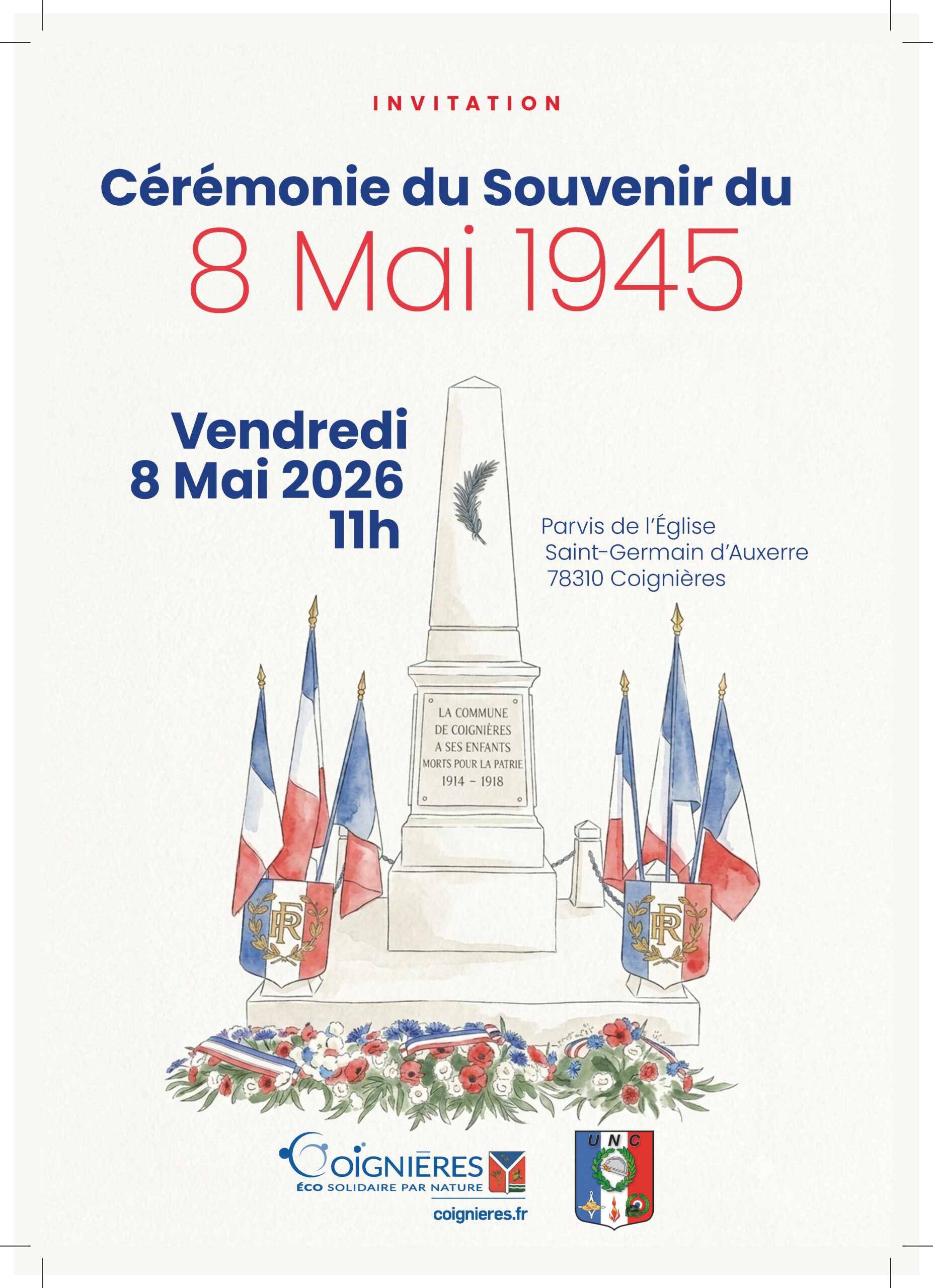 À l'occasion du 81e anniversaire de la Victoire du 8 mai 1945, le Maire Didier Fischer procédera à un dépôt de gerbes le vendredi 8 mai 2026, sur le parvis de l'Église Saint-Germain d'Auxerre, en présence d'élus, des membres de l’association des Anciens Combattants de Coignières ainsi que des jeunes élus du conseil municipal des enfants et des jeunes (CMEJ).