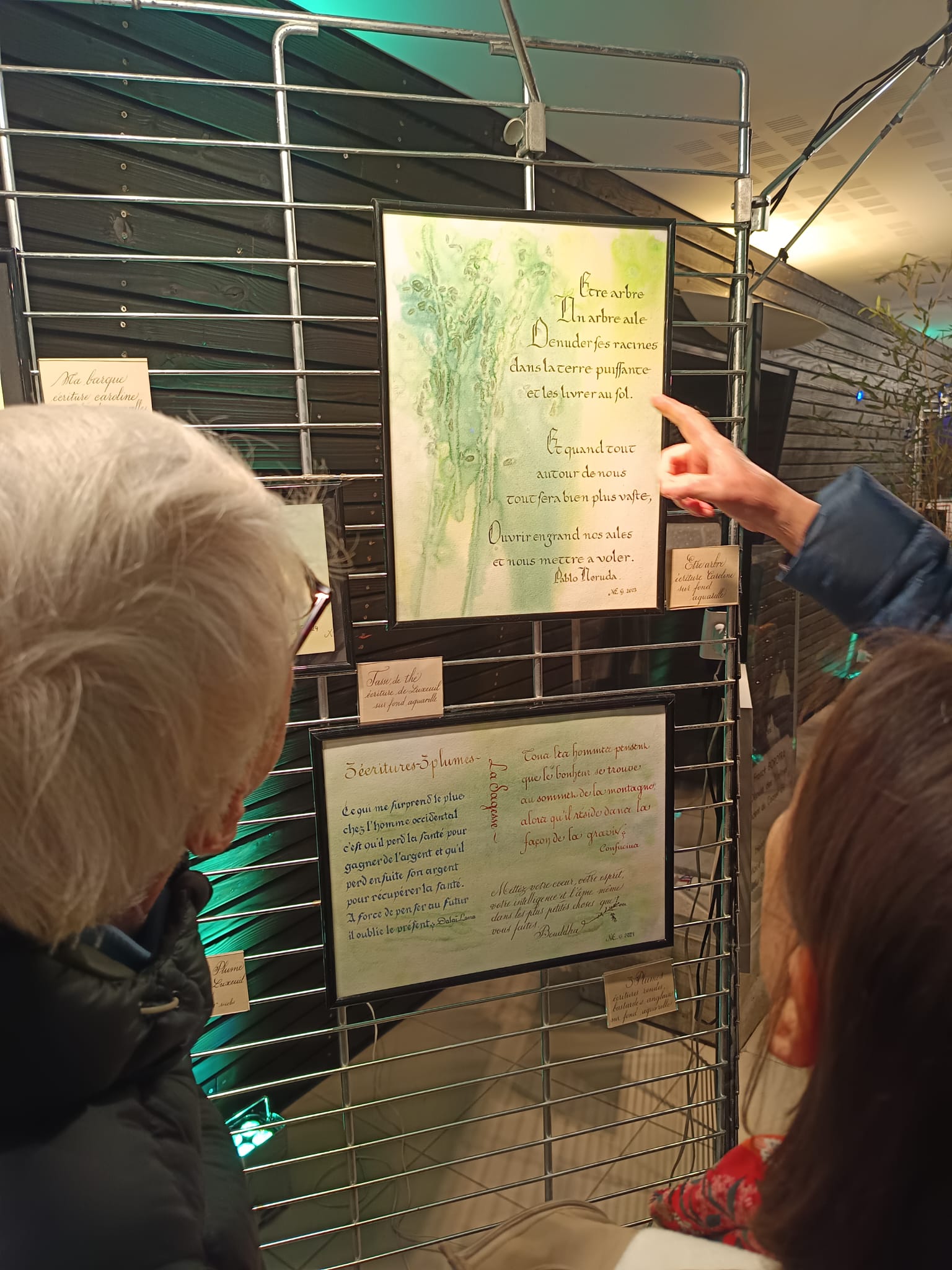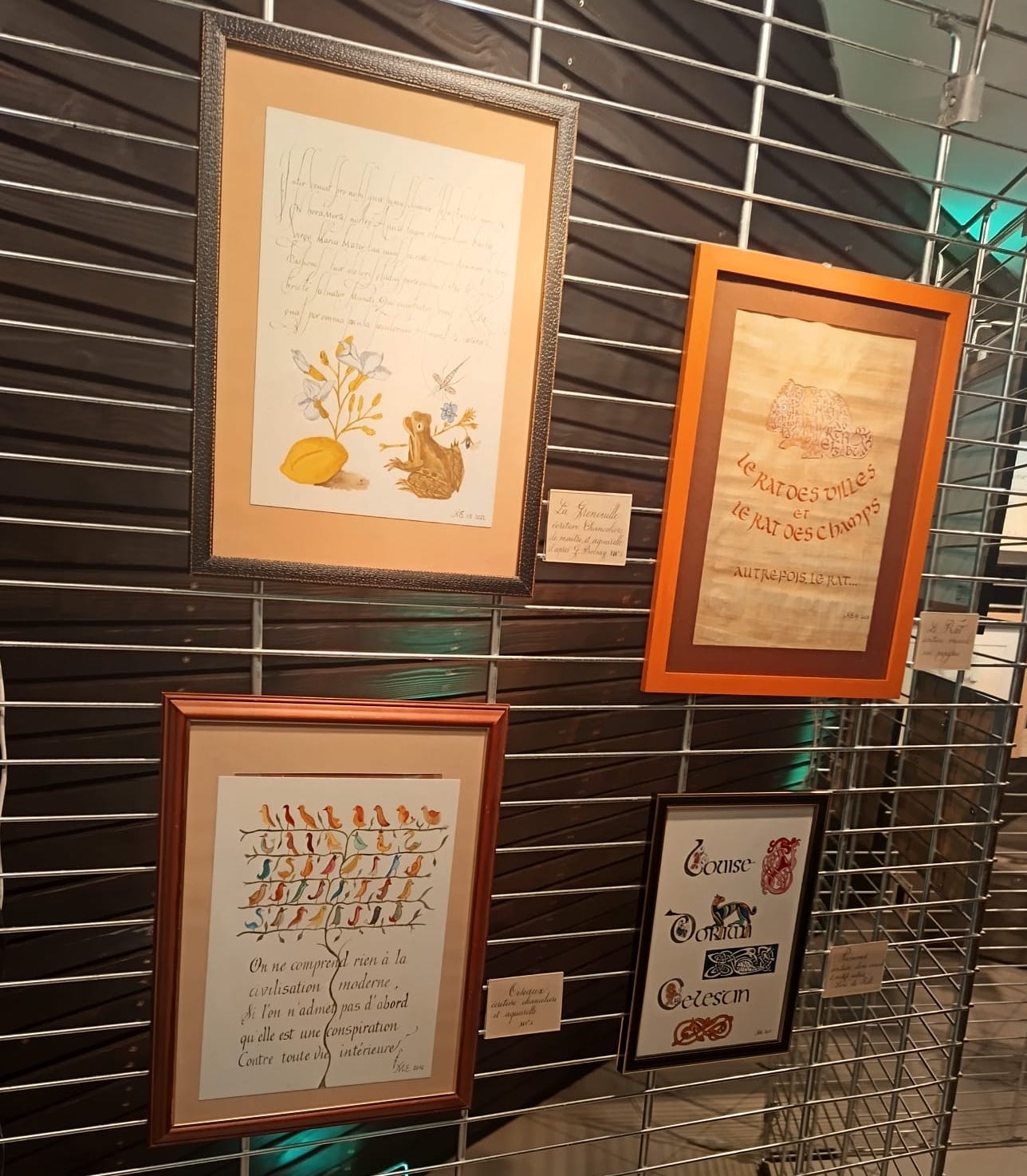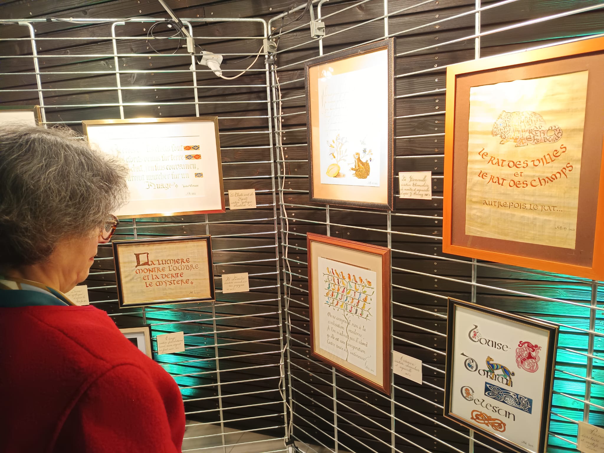 Quelle minutie de la part de Marion Evrard ! Sa pratique de la calligraphie (l'art de former élégamment les caractères de l'écriture) et de l'enluminure (illustration exécutée à la main qui orne un texte manuscrit), sur des supports variés, a enchanté les visiteurs, parmi lesquels le Maire et son adjoint délégué à la culture, le 10 novembre 2025.